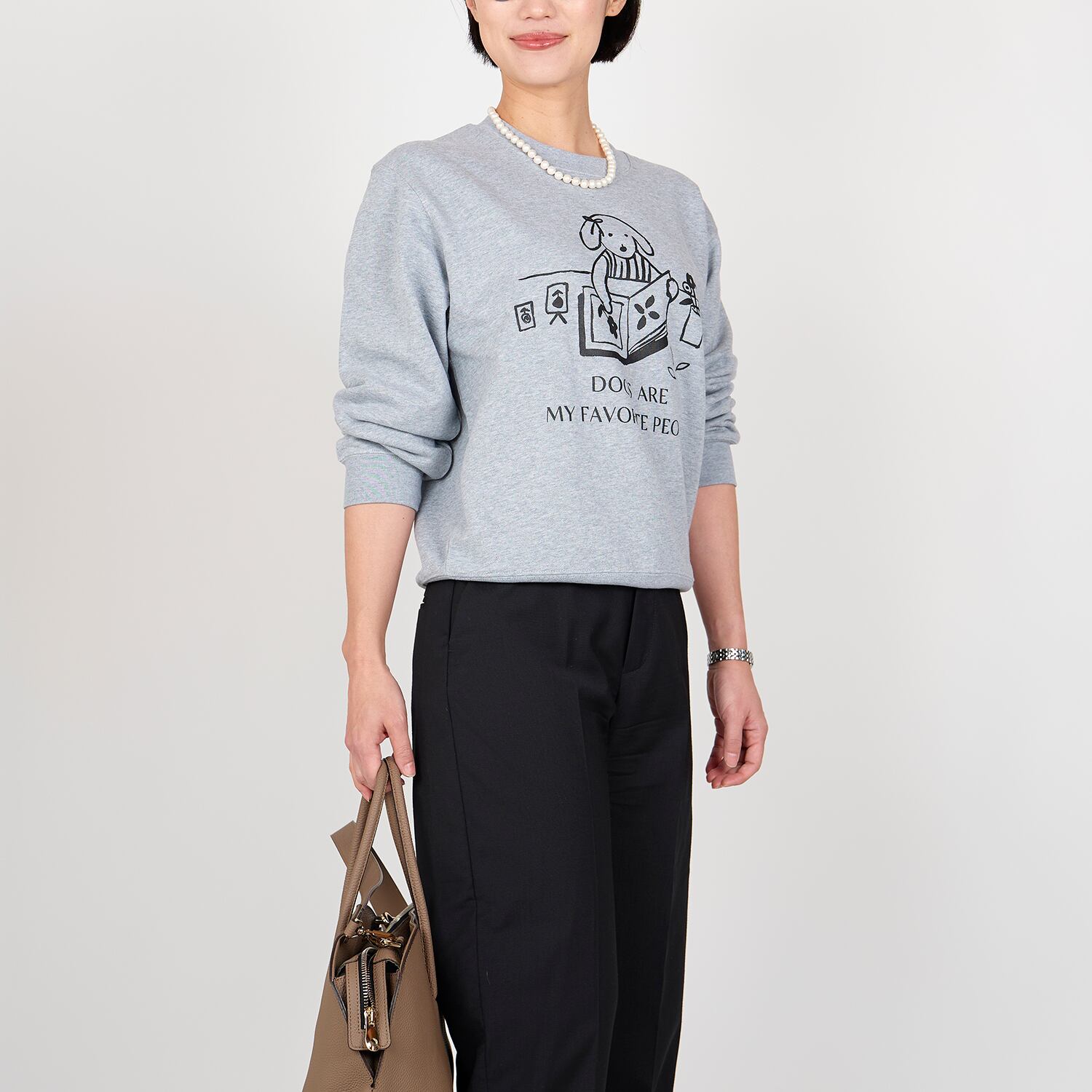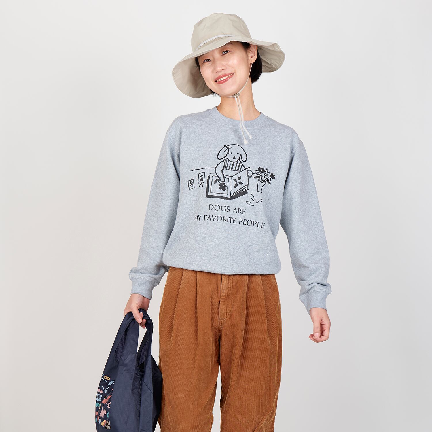 100%綿・裏パイル生地のトレーナー。ビーグルの女の子が押し花をしているイラストをプリント。カジュアルな装いはもちろん、リラックスタイムにもぴったり!